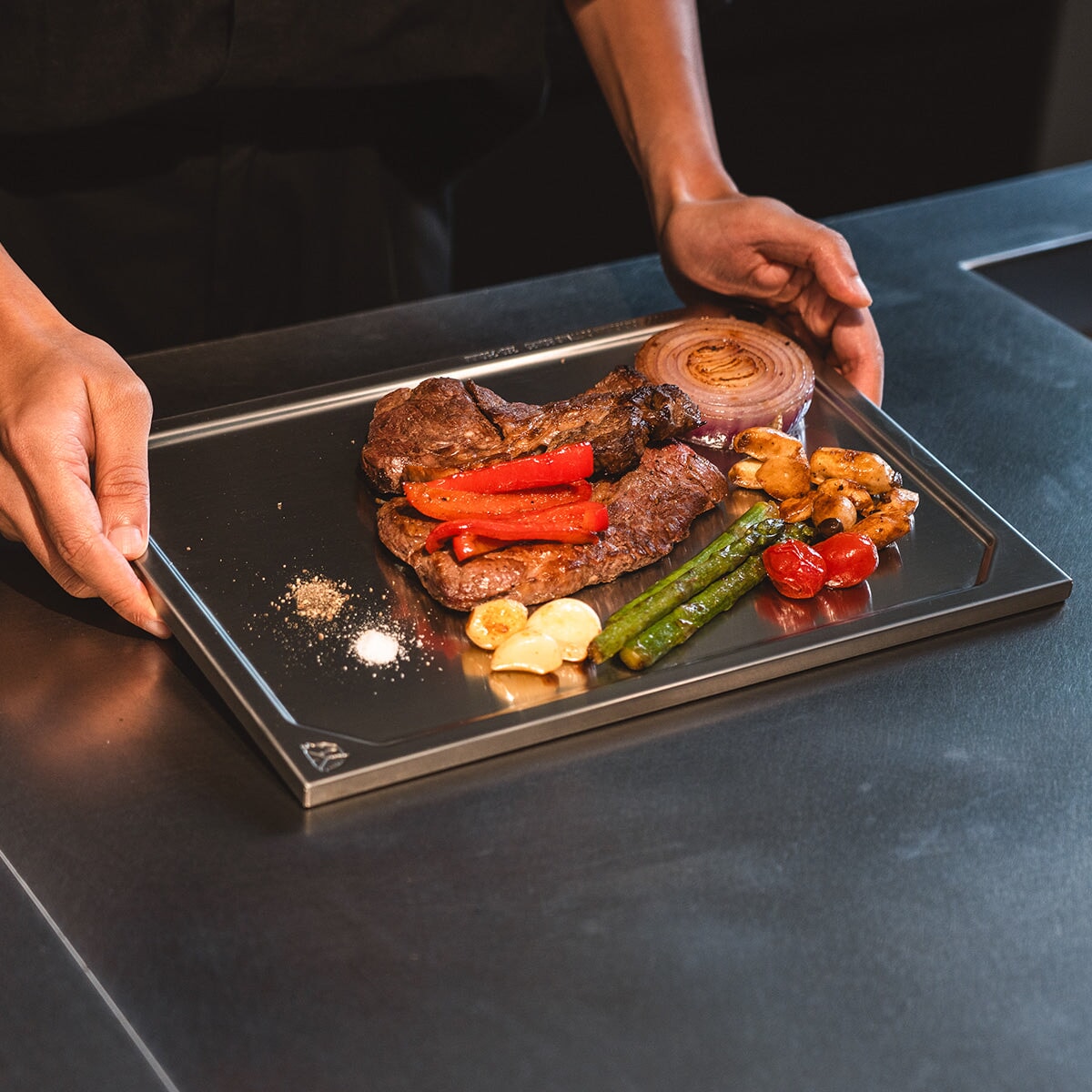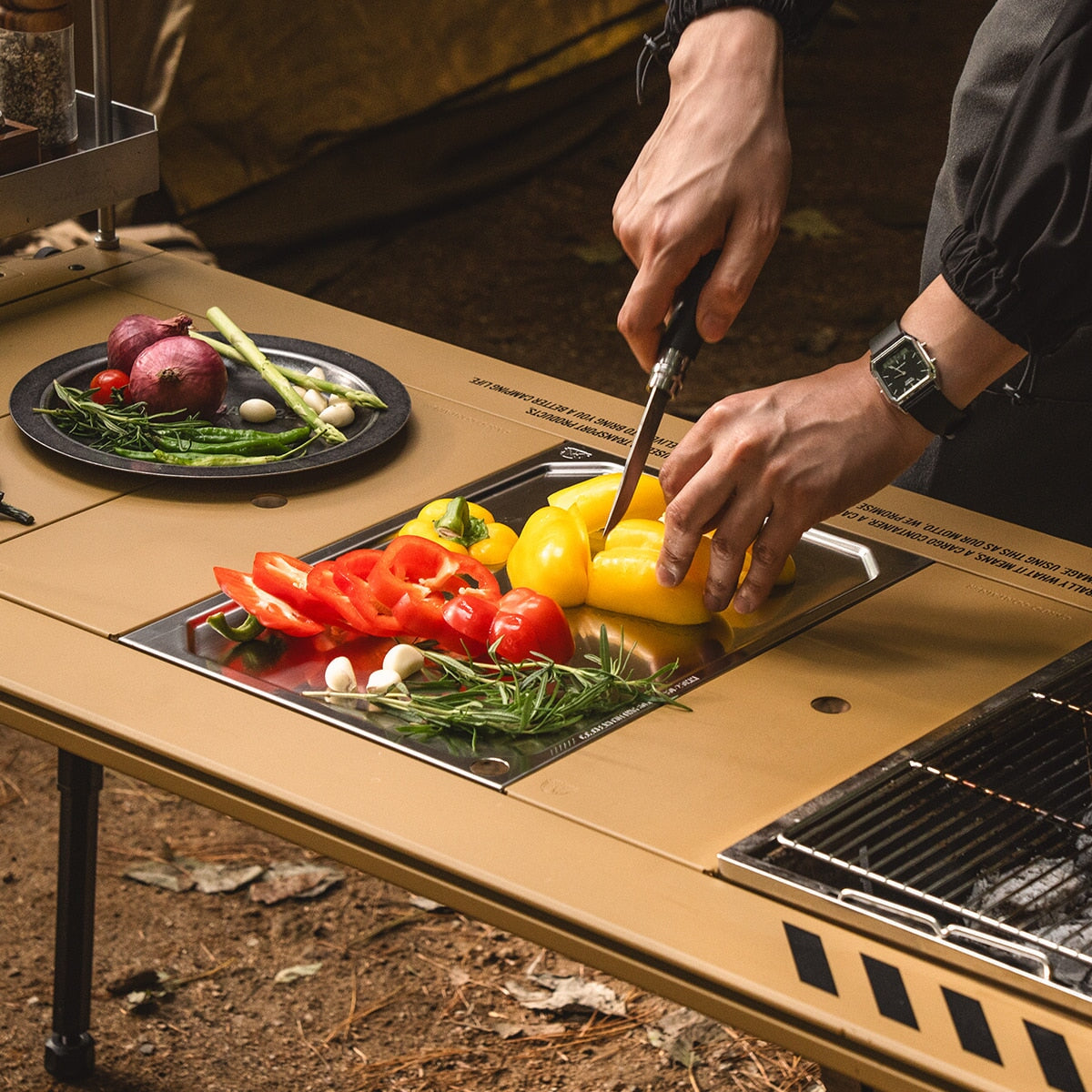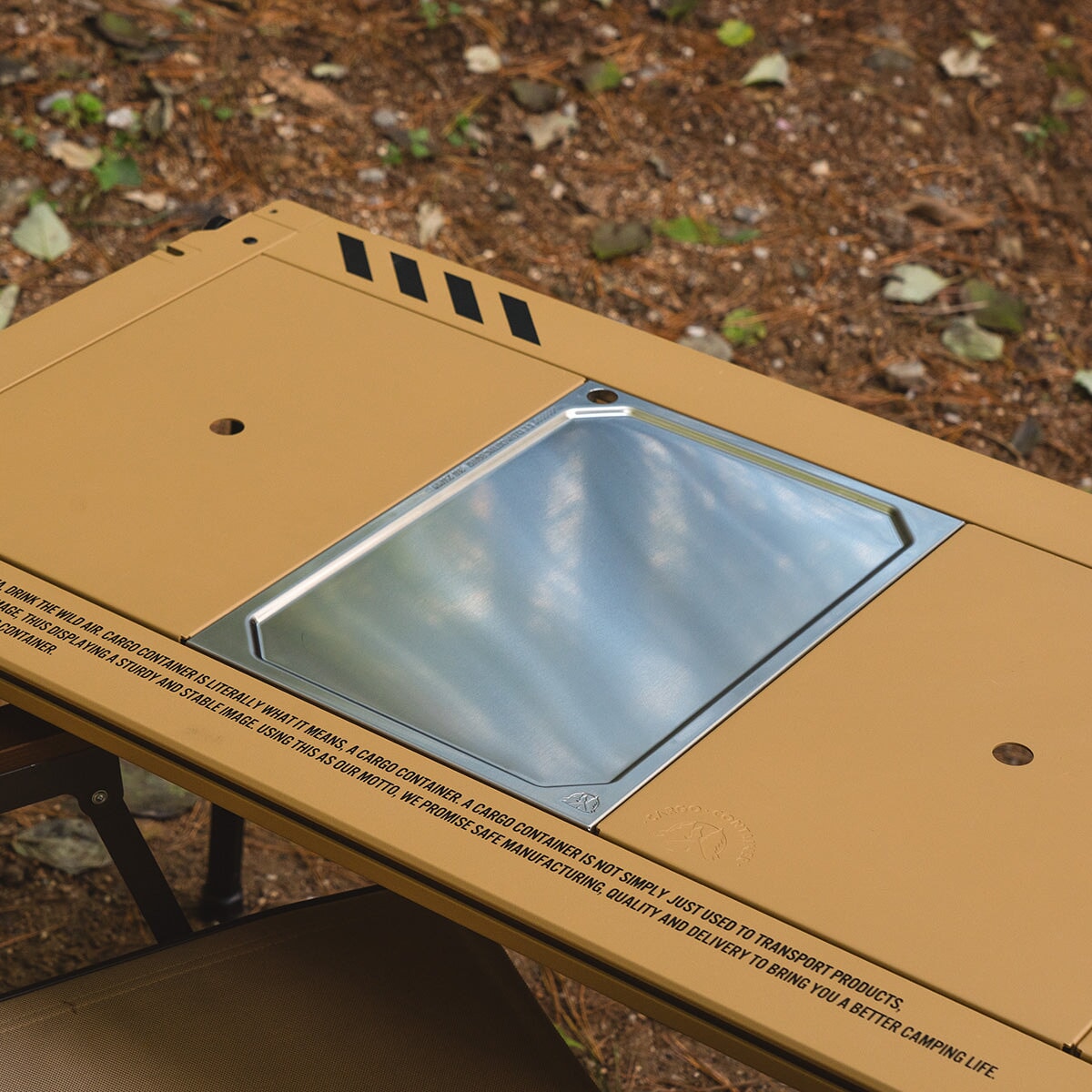The CARGO CONTAINER CC Clean Cutting Board is a premium stainless steel cutting and serving surface designed for both outdoor and indoor use. Crafted from high-quality 304 stainless steel, this board delivers exceptional hygiene, durability, and modern aesthetics. Its non-porous surface resists odor absorption, staining, and bacterial build up, making it an ideal choice for food preparation, serving, and campsite table setups. Designed to fit IGT one-unit table systems, it integrates seamlessly into modular camping kitchens while maintaining a refined, minimalist look.