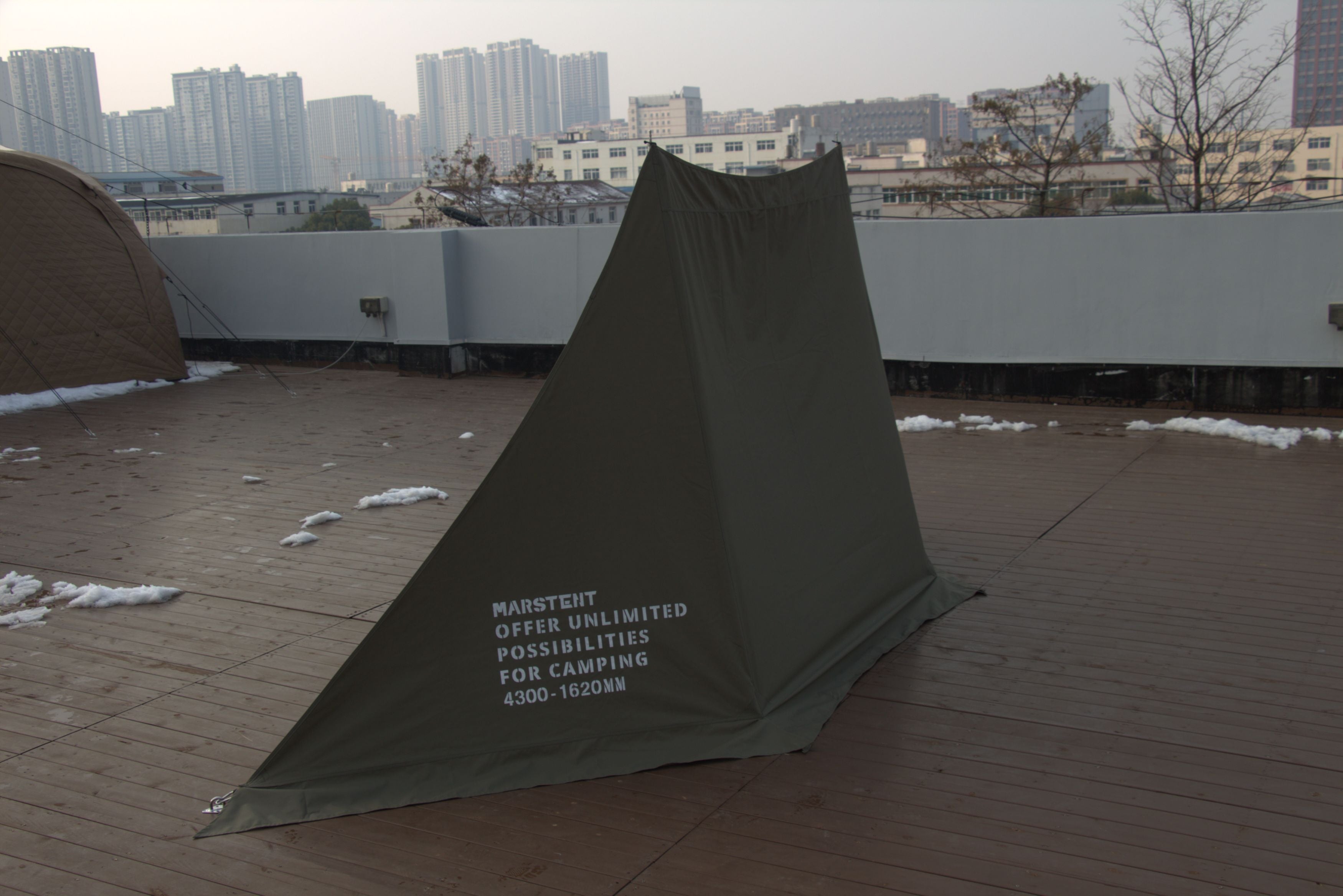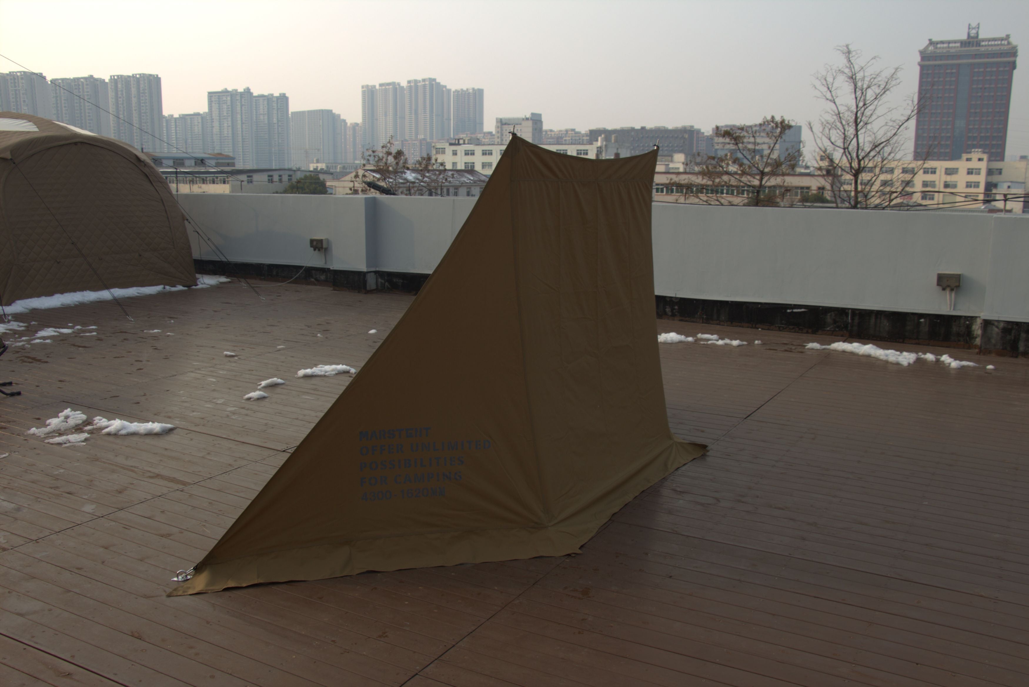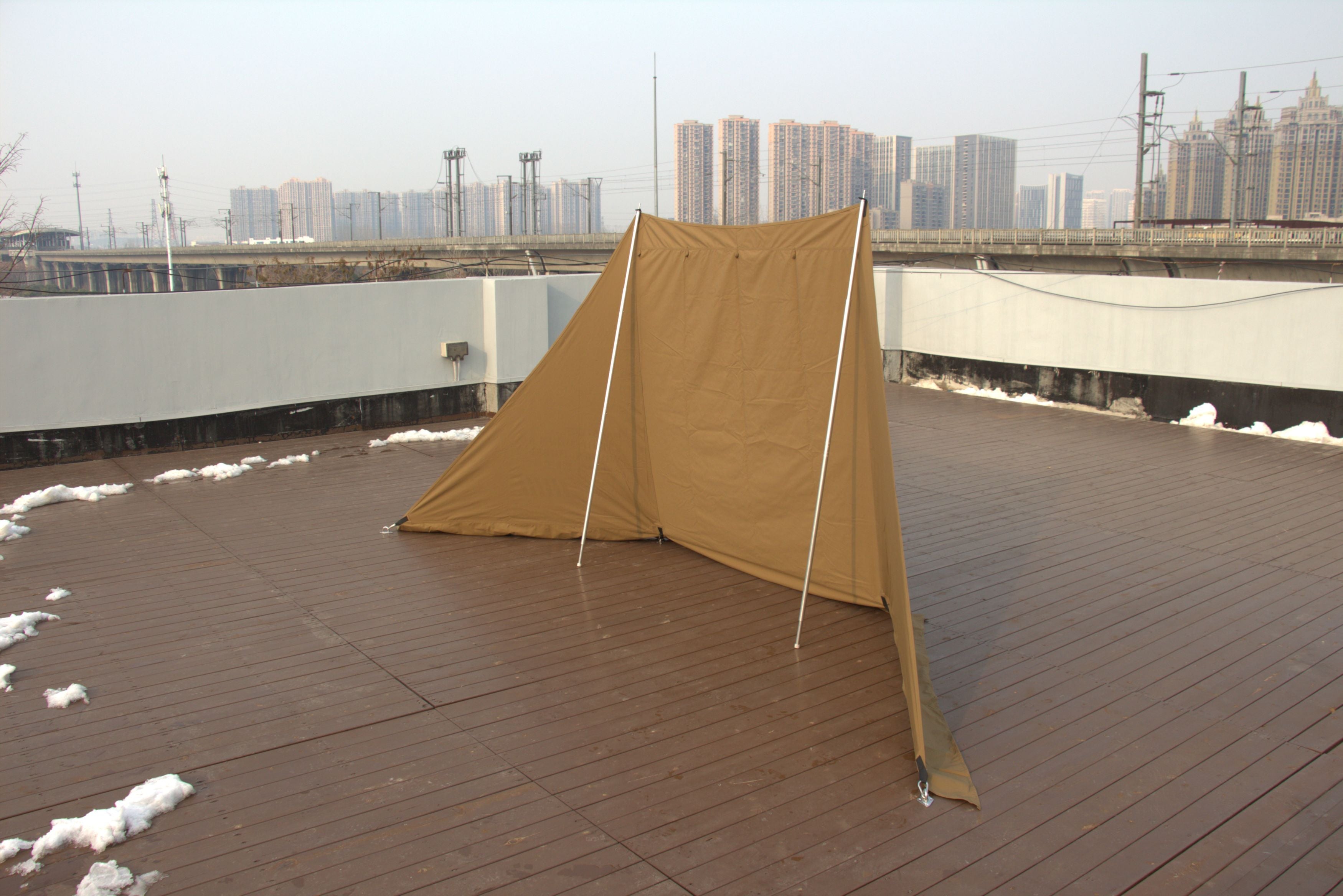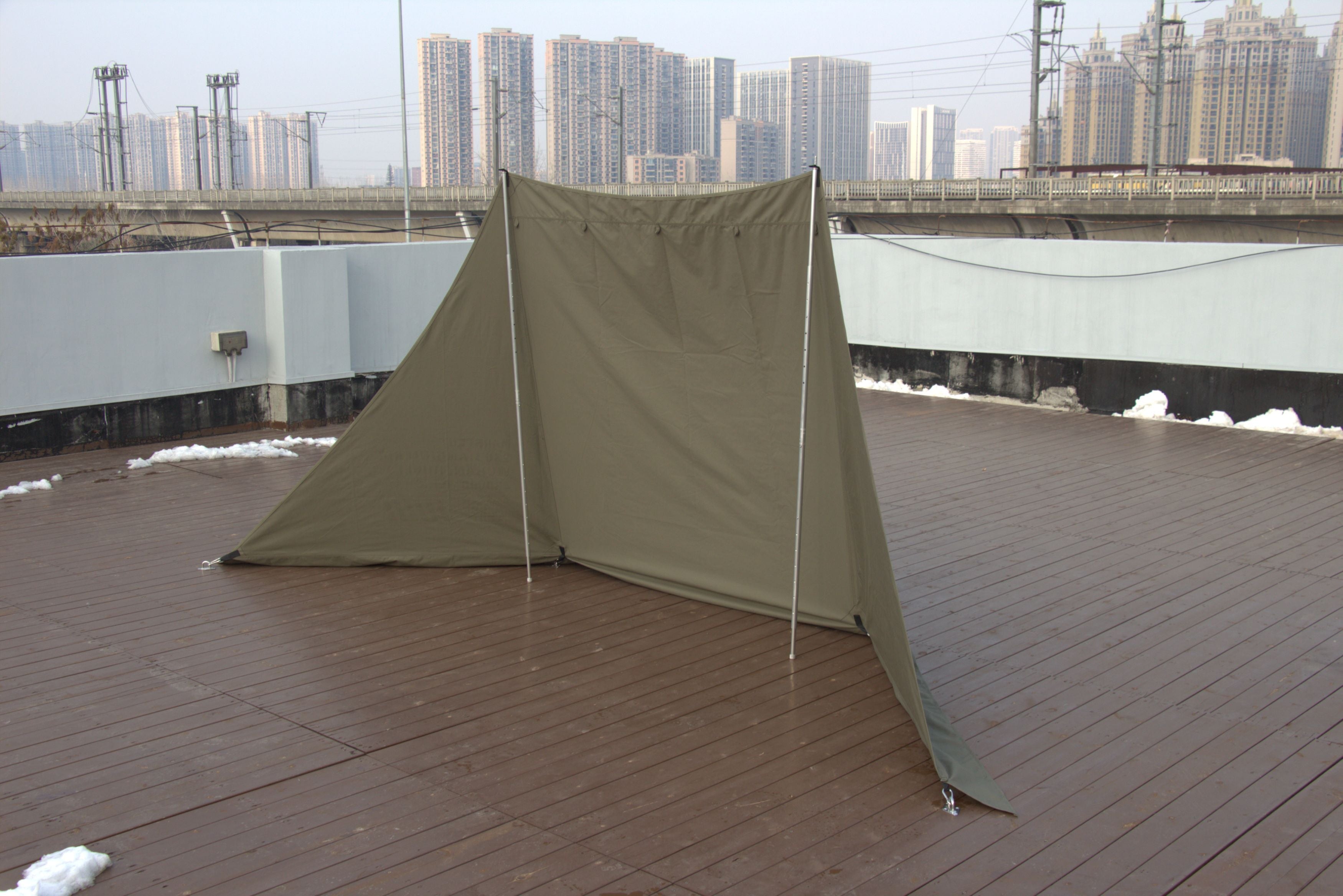 A: The TC cotton fabric offers good water resistance and excels at wind blocking, but it is not fully waterproof like coated synthetics. It is best used as a wind wall, shade, or shelter extension rather than a standalone rain tarp.